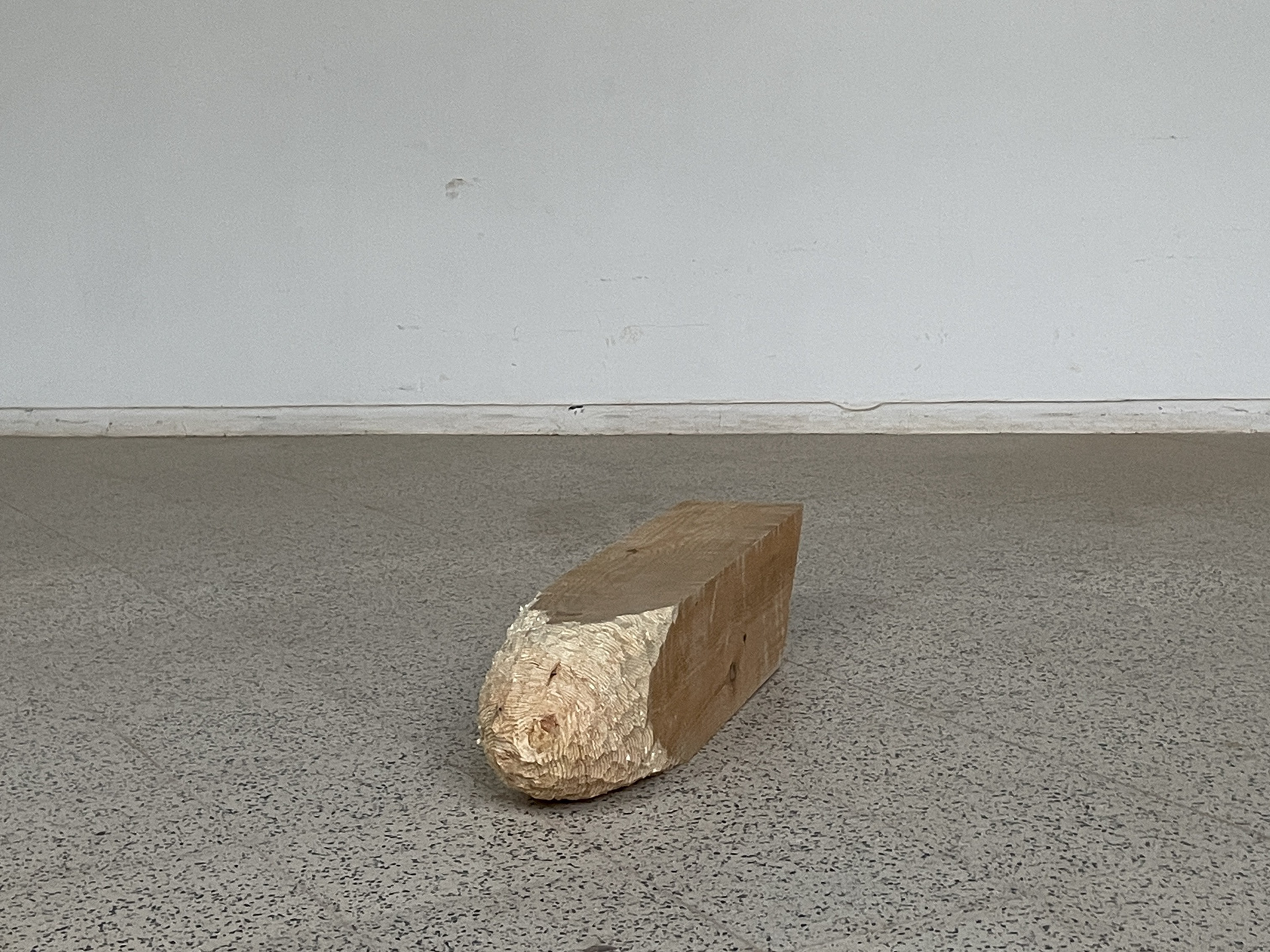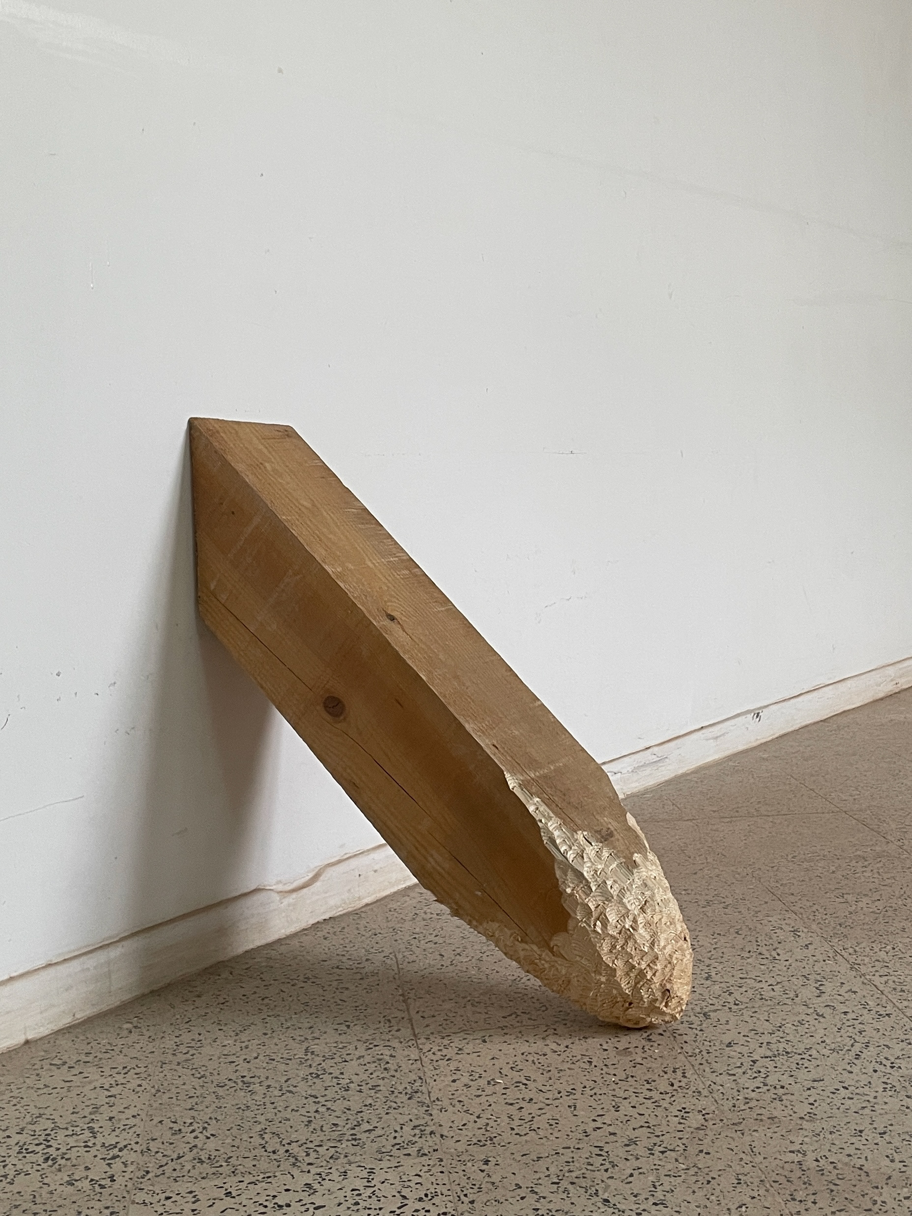 The form here is carved on one side and cut at a specific angle on the other, so that it leans against the wall of the physical space. When leaned against the wall, its phallic shape becomes more pronounced, while at the same time, it gives the wall a tactile effect. The shaped form and the wall—these two physical phenomena—gain bodily meaning through the methods of shaping and positioning. At the same time, when removed (or torn) from the wall, it carries references to an ordinary object and stands autonomously on the floor. It may either remain propped against something or lie idly on the ground in search of a place to belong.