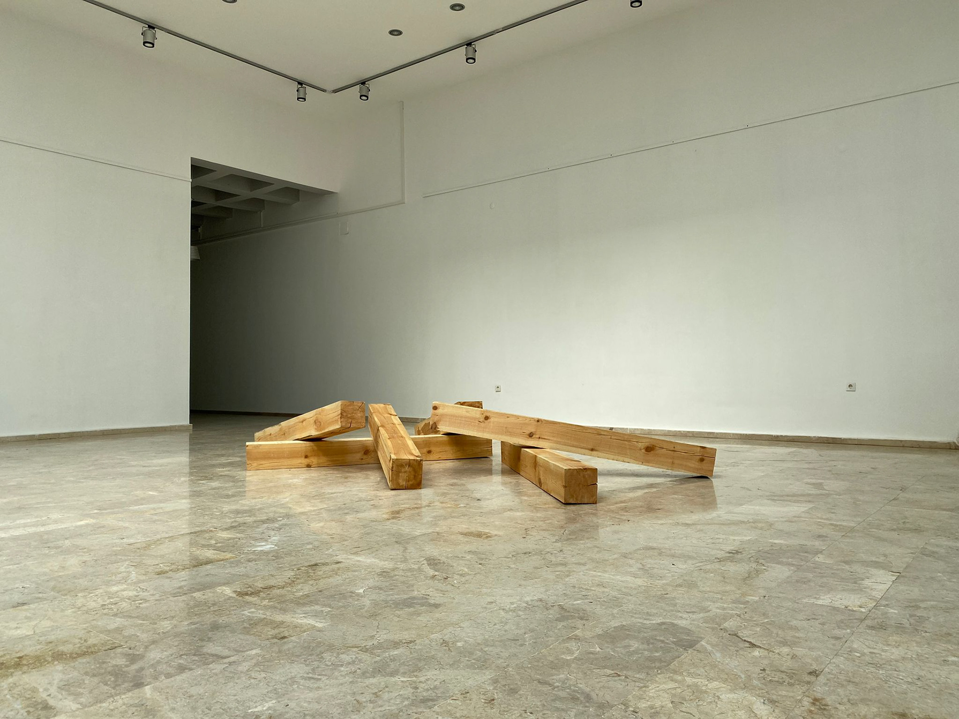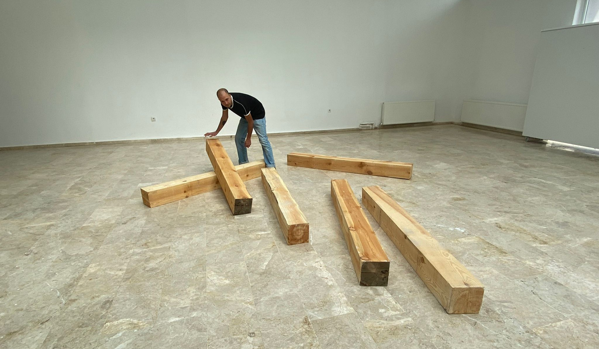 I cut some timbers to create a composition in which each would be placed on another. I came up with the idea to do this after seeing Michelangelo's Pieta in Vatican. I wanted each piece of timber to lay on another, carrying and supporting one another. A composition in which only the concept of carrying others and being carried by the others remain. While I was descending the stairs in Vatican, I said to myself there are basically two modes. Carrying and being carried. These two modes are the only two things that are left to me from Vatican. There is nothing else that remains except for those two things. I wanted to make use of these remains.